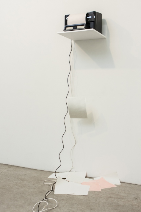 Printeris ik pēc septiņām minūtēm izmet lapu. Tā plivinādamās nokrīt uz grīdas. Uz lapām redzams kolāžu izejmateriāls – lielākas rūtiņas, mazākas, oranžas, zilas. Printeris turpina caurvēja darāmo. Rutīna un atkārtošanās.