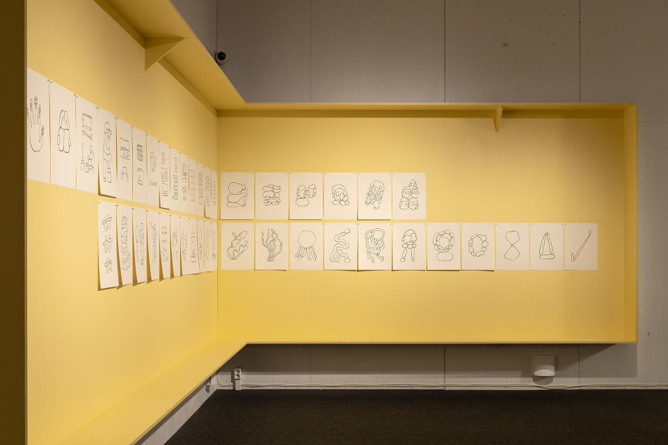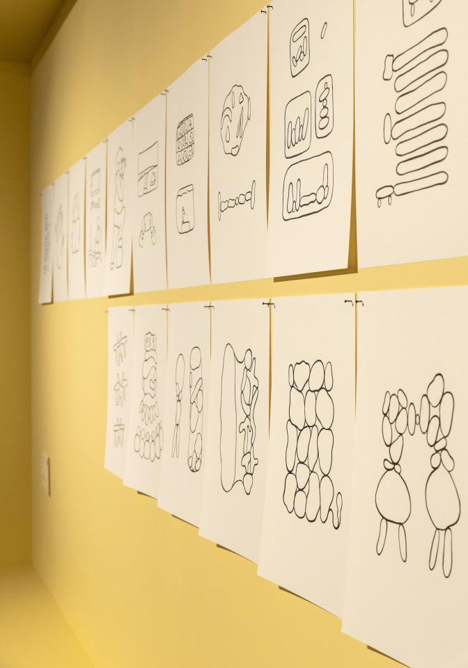 The work “Notes” consists of 44 riso prints – selected and redrawn drawings made as visual notes during lectures in the Professional Doctoral Programme at the Art Academy of Latvia. These notes were made primarily simply to draw and keep the hand moving: “What we call ‘conning’ implies that our knowledge is departing; since forgetfulness is an egress of knowledge, while conning substitutes a fresh one in place of that which departs, and so preserves our knowledge enough to make it seem the same.” (Plato "Symposium"). And drawings were also made in order to concentrate, remember what was being said more clearly, and think along actively. While drawing, I look for ways to translate speech into images, trying to stay on the threshold between the abstract and the recognizable. Moving forward from page to page, following the speaker’s pace and catching the next thought, drawing demands an exceptionally high level of concentration. There is a fundamental difference between language and image – language strives for precision, while the image is ambivalent and open to interpretation. A viewer won’t be able to use these notes to study for an exam, yet the laconic, distilled images arranged in sequence reveal the flexibility of perception and provide fertile ground for a new narrative.